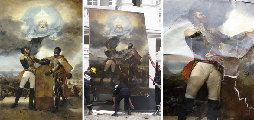 Serment des Ancêtres, damaged during the earthquake and retrieved from the Haitian Presidential Palace. Today, the Serment des Ancêtres is exhibited at the Louvre Museum under a show titled “Les Musées sont des Mondes” … http://mini-site.louvre.fr/trimestriel/2011/3/index.html#/28