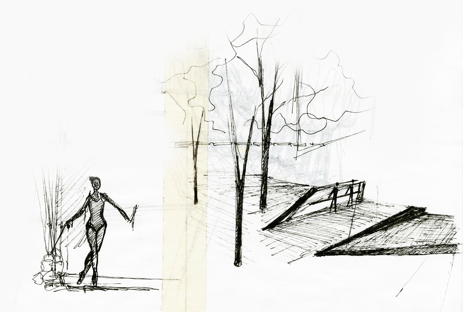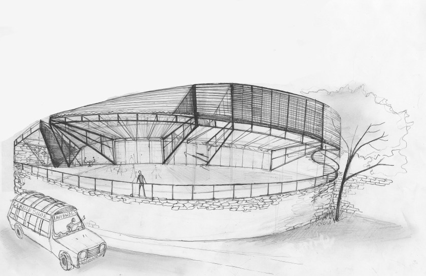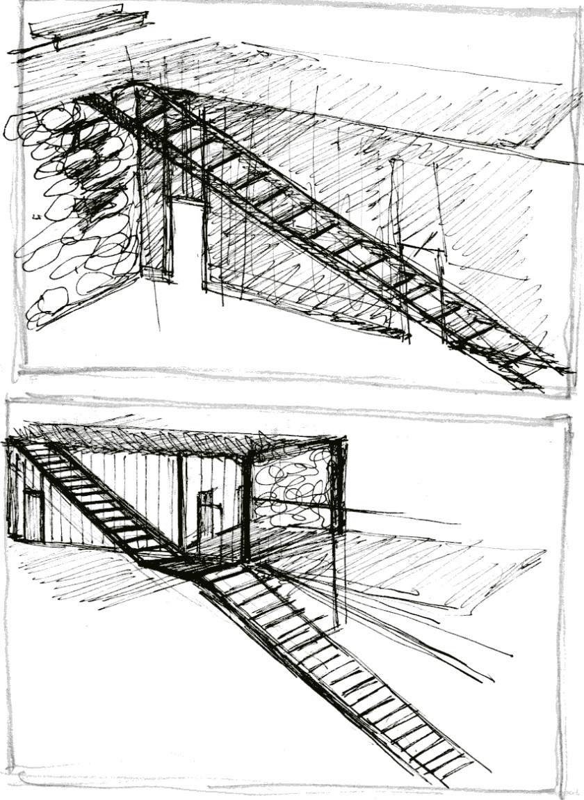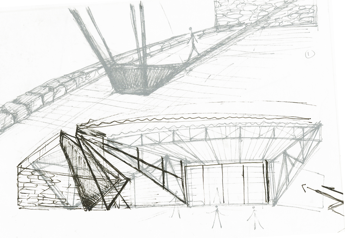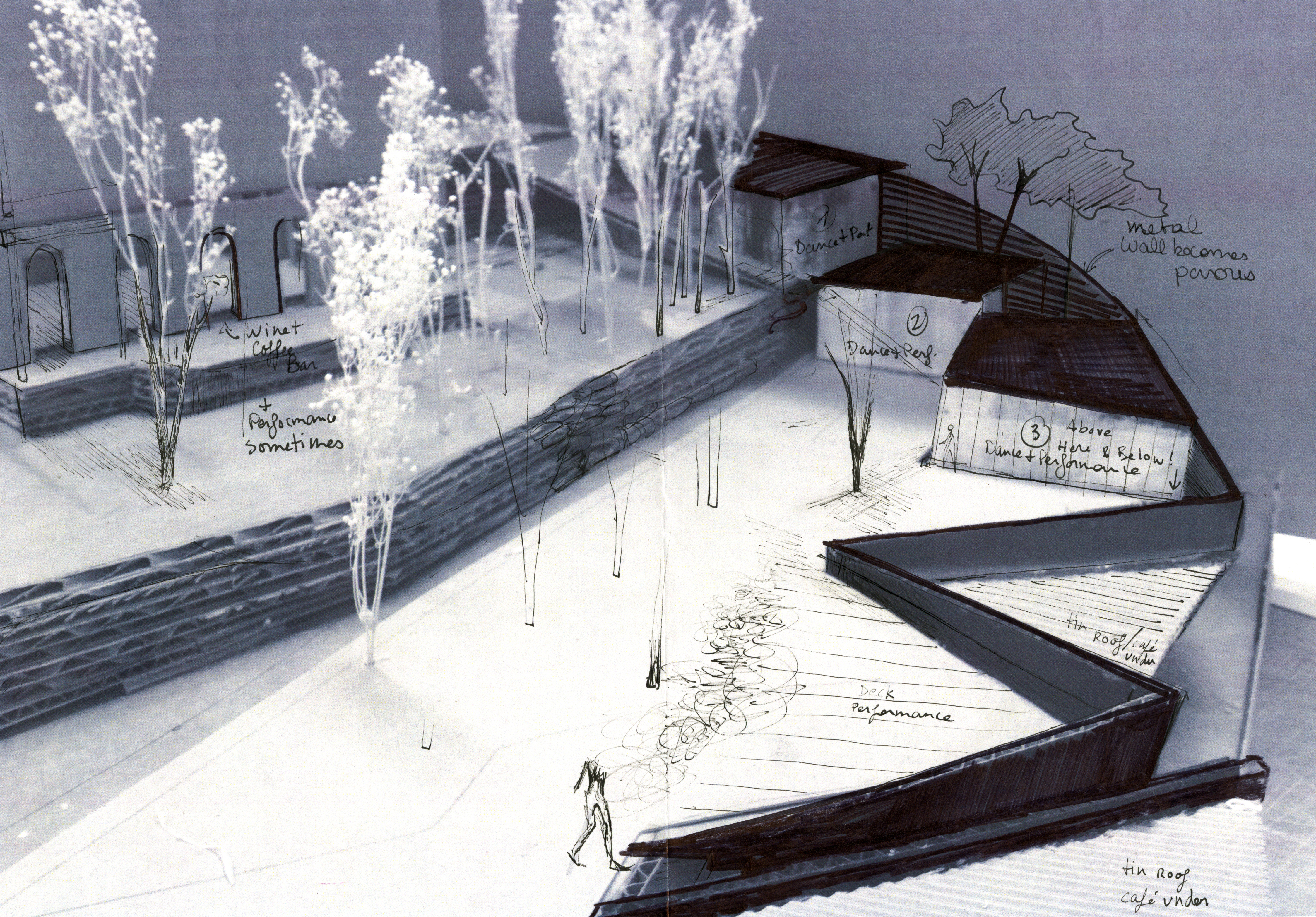 Dance Space, from early explorations to later design schemes incorporating the steel into the ground and structure even more